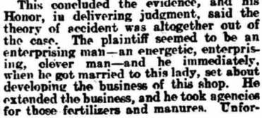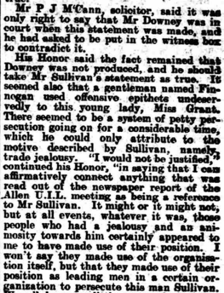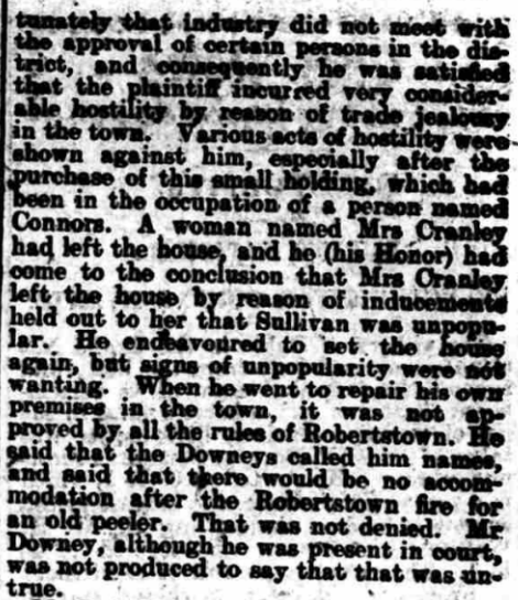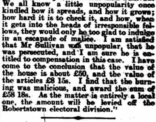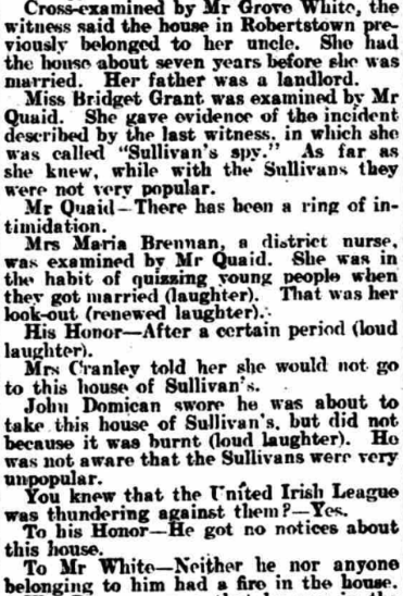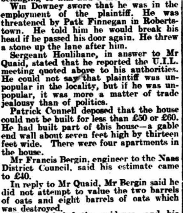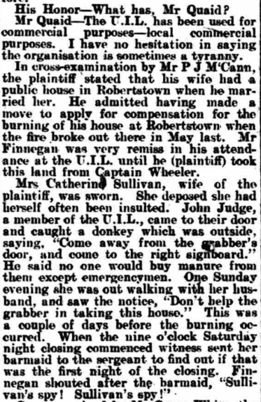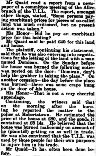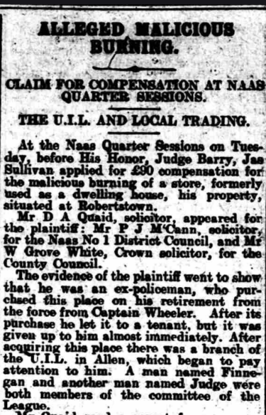 ALLEGED. MALICIOUS BURNING. CLAIM FOR COMPENSATION NAAS QUARTER SESSIONS. THE U.I.L. AND LOCAL TRADING. At the Naas Quarter Sessions Today, before his Honor, Judge Barry, Jas Sullivan applied for compensation for the malicious burning of store, formerly used as a dwelling bouse, his property, situated at Robertstown. Mr D A Quaid, solicitor, appeared for the plaintiff: Mr P J M’Cann, solicitor, for the Naas No 1 District Council, and Mr Grove White, solicitor, for the County Council. The evidence the plaintiff went to show that he was ex-policeman, who purchased this place on his retirement from the force from Captain Wheeler. After its purchase he let it to a tenant, but it was given up to him almost immediately. After acquiring the place there was a branch the U.I.L., in Allen, which began to pay attention to him. A man named Finnegan and another man named Judge were both members of the committee of the League. Mr Quaid read a report from a newspaper of a committee meeting of the Allen branch of the U.I.L. The report, amongst other things, stated, “Some persons paying exorbitant prices for pieces of so-called land was much criticised, but no present action was taken.” His Honor—Did he pay exorbitant price for this holding? Mr Quaid said he paid £4O for this land and house. The plaintiff, continuing his statement, said that he was also entering into negotiations for the letting of the land with man named Domican. On the Sunday before the house was burned the following notice was posted the door: ‘Domican, don’t help the grabber in taking the place.” On another occasion—the day before the place was burned—there was some crape hung on the door of his house. His Honor—That is not a cheerful appendage. Continuing, the witness said that on the morning after the burning he reported the matter to the police at Robertstown. He estimated the price of the house at £8O, and the goods contained at £8 14s. He believed that the house was burned maliciously on account of he (plaintiff) getting on so well in trade. He was also convinced that the U.I.L. was used those people for their own purposes to injure him in his trade. Mr Quaid —It has often been done before. His Honor—What has, Qnaid? Mr Quaid —The U.I.L. has been used for commercial purposes—local commercial purposes. _ I have no hesitation in saying the organisation is sometimes a tyranny. In cross-examination Mr P J M’Cann. the plaintiff stated that his wife had a public house in Robertstown when he married her. He admitted having made a move apply for compensation for the burning of the house at Robertstown when the fire broke out there in May last. Finnegan was very remiss in his attendance at the U.I.L. until he (plaintiff) took this land from Captain Wheeler. Mrs Catherine Sullivan, wife of the plaintiff, was sworn. She deposed she had herself often been insulted. John Judge, a member of the U.1.L., came to their door and caught a donkey which was outside, saying, “Come away from the grabber’s door, and come to the right signboard.” He said no one would buy manure from them except emergencymen. One Sunday evening she was out walking with her husband, and saw the notice, “Don’t help the grabber in taking this house.” This was a couple of days before the burning occurred, When the nine o’clock Saturday night closing commenced witness sent her barmaid to the sergeant to find out if that was the first night of the closing. Finnegan shouted alter the barmaid, “Sullivan’s spy! Sullivan’s spy!’’ ■ Cross-examined by Mr Grove White, the witness said the house in Robertstown previously belonged to her uncle. She had the house about seven years before she was married. Her father was a landlord. Miss Bridget Grant was examined, Mr Quaid. She gave evidence of the incident described by the last witness, in which she was called “Sullivan’s spy.” As far she knew, while with the Sullivans they were not very popular. Mr Quaid – There has been a ring of intimidation. Mrs Maria Brennan, district nurse, was examined Mr Quaid. She was in the habit of quizzing young people when they got married (laughter). That was her look-out (renewed laughter).; … His Honor—After a certain period (loud laughter). Mrs Cranley told her she would not to this house of Sullivan’s. John Domican swore he was about to take this house of Sullivan’s, but did not because it was burnt (loud laughter). He was not aware that the Sullivans were very unpopular. You knew that the United Irish League was thundering against them?—Yes. His Honor—He got no notices about this louse. To Mr White—Neither he nor anyone belonging to him had a fire in the house. Wm Downey swore that was in the employment of the plaintiff. He was threatened by Pat Finnegan Robertstown. He told him would break his head if he passed his door again. He threw a stone up the lane after him. Sergeant Houlihane, in answer to Mr Quaid, stated that he reported the U.I.L. meeting quoted above to his authorities. He could not say that plaintiff was unpopular in the locality, but if was unpopular, it was more a matter of trade jealousy than of politics. Patrick Connell deposed that the house could not built for less than £5O or £6O. had built part of this house— a gable end wall about seven feet high thirteen feet wide. There were four apartments in the house. , „ Mr Francis Bergin. engineer to the Naas District Council, said his estimate came to £40. In reply to Mr Quaid. Bergin said he did not attempt to value the two barrels oats and eight barrels of oats which was destroyed. ~ … This concluded the evidence, and his Honor, in delivering judgment, said the theory of accident was altogether out of the case. The plaintiff seemed to an enterprising man—an energetjc, enterprising, clever man —and be immediately, when got married to this lady, set about developing the business this shop. He extended the business, and took agencies for those f