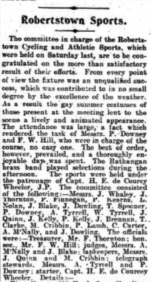 A newspaper report demonstrating the variation of sporting events that took place at Robertstown Sports and those who organised and participated on the day.