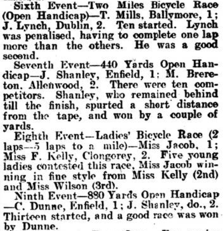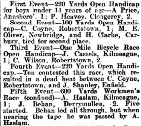 Robertstown Sports. The committee in charge of the Robertstown Cycling and Athletic Sports, which wore held on Saturday last, are to he congratulated the more than satisfactory result of their efforts. From every point of view the fixture was an unqualified success, which was contributed to in small degree the excellence tho weather. As a result the gay summer costumes of those present at the meeting lent to the scene a lively and animated appearance. The attendance was large, fact which rendered tho task of Messrs. P. Downey and F. W. Hill, who were in charge of the course, no easy one. The best order, however, prevailed, and a thoroughly enjoyable day.,was spent. The Rathangan brass band played selections during the afternoon. The sports were held under the patronage of Cpt. H. E. Courcy Wheeler, J.P. The committee consisted of the following:—Messrs. J. Whaley, J. Thornton, P, Finnegan, P. Kearns, L. Nolan, J. Blake, J. Dowling, T. Spooner, P. Downey, A. Tyrrell, W. Tyrrell, J. Quinn, J. Kelly, P, Kelly. J. Brennan, T. Clarke, M. Cribbin, P. Lamb, C. Carter, A. M’Nally, and J. Dowling. The officials were;—Treasurer, Mr. F. Thornton ; bon. sec.. Mr, F. W. Hill; judges, Messrs. A. and J. Blake; Lapkeepers, Messrs. J. Quinn and M. Cribbin: telegraph stewards, Messrs. A, • Tyrrell and P. Downey; starter, Capt. H. B. Wheeler. Details:— First Event—220 Yards Open Handicap for boys under 14 years of ago—A Price, Annsboro’. 1: P. Heavey, Clongorey, 2. Second Event—l00 Yards Open Handicap—C. Coyne, Robertstown. 1; M. K. Oliver, Newbridge, and H. Clarke, Carbary, tied for second place. Third Event—One Mile Bicycle Race Open Handicap—J. Cassels, Kilmeague, 1; C. Wilson. Robertstown, 2. Fourth Event—220 Yards Open Handicap.—Ten contested this race, which resulted in a dead heat between C. Coyne, Robertstown, and J. Shanley, Enfield. Fifth Event—600 Yards Workmen’s Race (confined) —A. Haslam, Kilmeague, 1; J. Behan, Derrymullen, 2. Five started. Behan led all through, but when nearing the tape was passed A. Haslam. Sixth Event—Two Miles Bicycle Race (Open Handicap)—T. Mills, Ballymore, 1; J. Lynch, Dublin, 2. Ten started. Lynch was penalised, having to complete one lap more than the others. He was a good second. Seventh Event—440 Yards Open Handicap—J. Shanley, Enfield, 1: 51. Brereton. Allefiwood, 2. There were ten competitors. Shanley, who remained behind till the finish, spurted short’ distance from the tape, and won by a couple yards. Eighth Event—Ladies’ Bicycle Race laps to mile) —Miss Jacob, 1; Miss F. Kelly, Clongorey, 2. Five young ladies contested this race. Miss Jacob winning in fine style from Miss Kelly (2nd) and Miss Wilson (3rdl. Ninth Event—880 Yards Open Handicap —C. Dunne, Enfield, 1; J. Shanley, do., 2. Thirteen started, and good race was won Dunne. „ Tenth Event—Pony flare. For ponies 14.2 and under; catch weights: miles flat.—Mr. J. Bvrne’s Signoretta. 1: Mr. Lawler’s Butterfly. 2: Mr. P. Nolan’s Molly Bawn, 3. Eight starred for this race, which was won about half a length. There was an object ion lodged against Signoretta. it being declared that she was over 14.2 hands, but it was over- Eleventh Event—Gymkhana Race (about 2 miles! – Winners same previous race. The riders had to W 0 yards alongside their mounts and then saddle. Butterfly was first saddled. On the completion the round the riders had to dismount, eat a sponge cake, and drink a bottle soda water. Here Signoretta started oft first, closely followed -Butterfly, and maintaining the lead for the rest of the race, won easily. . Twelfth Event—Donkey Race. Half a mile, run on road, pure-bred Irish donkevs-J. Spooner’s Ladas. 1; C. Dowling Rosaleen. 2. Rosaleen was leading until a few vards from home, when her jockey fell, and thus enabled Ladas come off victorious. „ , . _ .. Thirteenth Event —Swimming Competition from Canal Bridge to front of Hotel; about 100 vards—J. Jacob, 1: P. Leeson, 2. Only three competitors lined the plank, and it was amidst much cheering that they took the water. Jacob, who swam part of the way his back, received a great ovation, as came off an winner. Shortly afterwards Lesson came up. the other competitor having retired after half the course was completed.