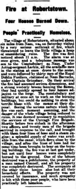 The village of Robertstown, situated about six miles from Naas, was on Saturday visited by a very serious outbreak of fire, which threatened to leave the little village a heap of smoldering ruins. The was first noticed about 11 a.m. The alarm was at once given, and a telephone message was sent to the Constabulary at Naas. Under Acting-sergeant Larkin, all the available men in the station at once drove to the scene. and were followed by thirty men of the Royal Dublin Fusiliers stationed at Naas Barracks. under Captain Grimshaw. On their arrival the fire had assumed serious dimensions, and a strong westerly breeze fanning the flames, they had quickly spread to four houses adjacent to the forge. The constabulary and the military at once set to work on the burning buildings, but could do nothing to stem the terrific blaze with the means at their disposal. Seeing the serious nature which the fire was each moment assuming, and the danger of the whole village being reduced to ruins, it was deemed necessary to requisition the services of the Curragh Fire Brigade. Shortly before two o’clock in the afternoon two officers and twenty men of the brigade arrived in response to the call, and brought with them four lines of hose and a steam engine: a splendid supply of water was available from the canal which flows close by the village, and after the lines of hose had for time brought to bear on the burning buildings the fire was at last got under, but not until four houses were completely burned to the ground. One of the house destroyed was a public house, the property of a man named Connell, and all his property was completely destroyed. The occupants of the other three homes also lost all their household effects. The property was not covered by insurance, and much sympathy is felt with those poor people, who have been practically been left homeless.