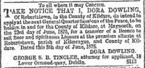 The previous post made reference to a meeting at Dowling’s Hotel, Robertstown. The proprietor on that date was Dora Dowling. The valuation books shows Dowling’s Hotel was located where Mullaney’s shop and bar is today.
